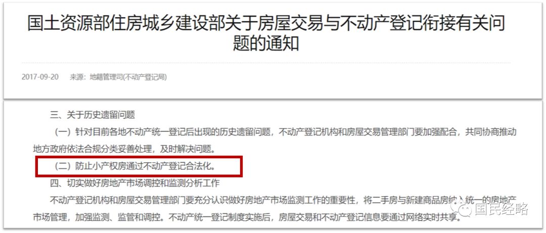 在不动产登记过程中,包括顶层在内的多地都纷纷强调:防止小产权房通过不动产登记合法化。