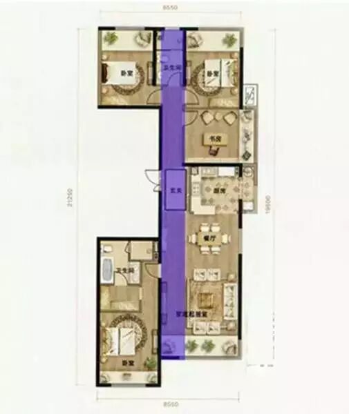 这种户型存在采光问题,中间走廊部分很难采到光,另外走廊也无法利用,只能浪费。房子比例不合理不协调,看着都觉得难受。