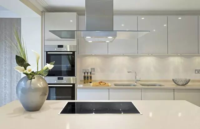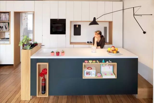 如果你的厨房是一个开放式厨房,那么可以采用嵌入式线型灯,它在保证操作台的采光的同时还可以给整个空间带来一种戏剧性的视觉效果。通常来说在这个大空间内厨房的吊顶将比客厅的更低,太高的光源会让光线过于分散。
